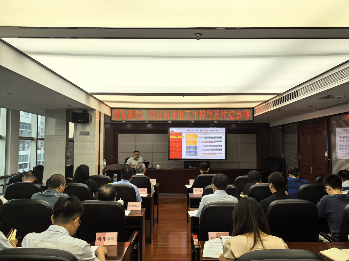 为进一步提升中心开展项目后评价工作的业务能力,推动我省评估评审工作创新发展,9月19日下午,中心举办今年第三期《周五讲堂》(总第四十二期),邀请厦门市政府投资项目评审中心项目管理部主任刘启作《项目后评价工作程序及注意事项》专题讲座。刘启主任从项目后评价的政策依据、工作程序、评价重点、注意事项等方面与大家作了深入的分享交流,并结合实际案例,对常见问题和关键注意事项进行细致剖析,对中心高质量推进项目后评价工作具有很强的指导性和可操作性。中心领导和专业技术人员参加了专题讲座,讲座达到预期效果。