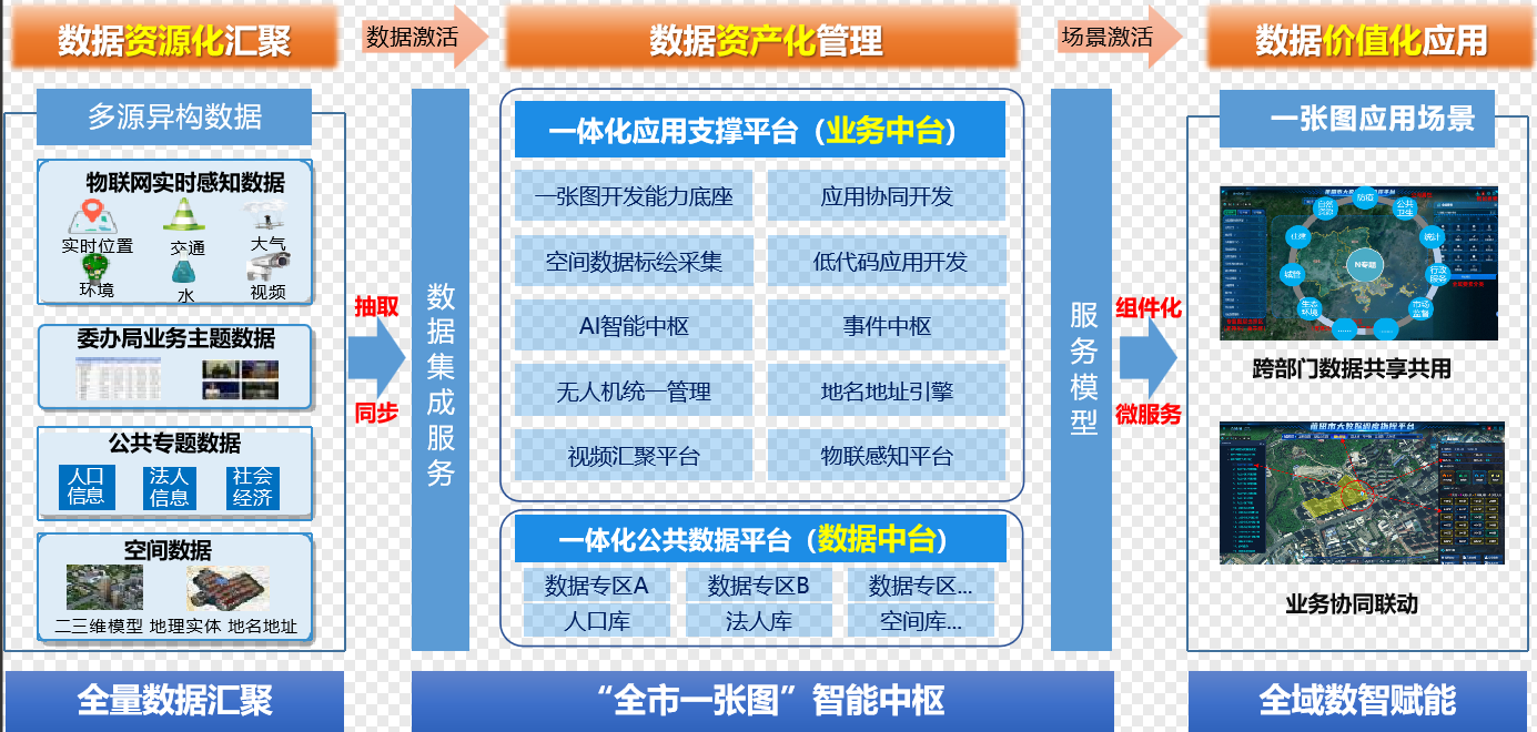 (一)业务系统全聚合。针对部门间应用割裂、封闭独立等问题,运用“数据中台+业务中台”架构打造智能中枢,以高精度天地图为底图,聚合各级各部门130个信息系统,汇聚77.84亿条公共数据,接入14.0万路视频监控,协同开发492个数字化应用场景,推动64个部门图上办公。
