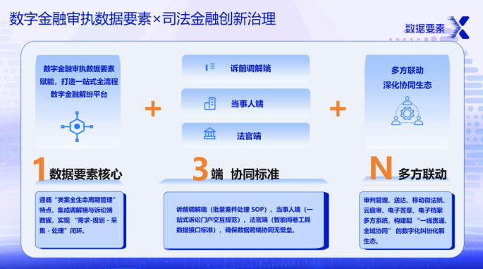 在数据要素建设方面,福州市电子信息集团深度整合法院审判数据、金融机构纠纷案例数据、当事人履约数据等多源数据,打通“数据壁垒”,提炼出52个类型要素,实现对金融纠纷的全面精准刻画。架构设计上采用“1+3+N”模块化布局,即“1”数据要素核心,通过数字金融审执数据要素赋能,打造一站式全流程数字金融解纷云平台;“3”端协同标准,诉前调解端(批量案件处理SOP)、当事人端(一站式诉讼门户交互规范)、法官端(智能阅卷工具数据接口标准),确保数据跨端协同无壁垒;“N”项系统协同功能,基于在线调解、在线庭审、异步庭审、在线签章等,对审执流程进行“碎片化重组”,数据要素贯穿金融纠纷全链条,辅助法官精准裁判。