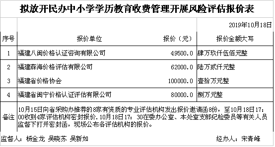 根据《福建省发展和改革委员会采购管理规定(试行)》,对拟放开我省民办中小学学历教育收费管理开展风险评估项目采取书面询价方式,按最低报价法确定风险评估项目服务商。10月15日发出报价邀请函8份,截止报价时间10月18日16:00,收到4家评估机构的密封报价函。10月18日17:30,在局办公室、本处支部纪检委员等有关人员监督下,现场打开密封报价函,公布各评估机构报价如下: