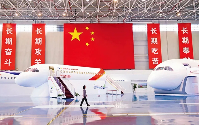 民用航空是国家重要的战略产业。经过不懈努力,我国国产民用飞机已初步形成统一命名的“C系列”:C909支线客机、C919中短程窄体客机以及C929中远程宽体客机。图为2025年3月5日,在中国商飞上海飞机设计研究院拍摄的C919、C929的展示样机。 新华社记者 刘颖/摄