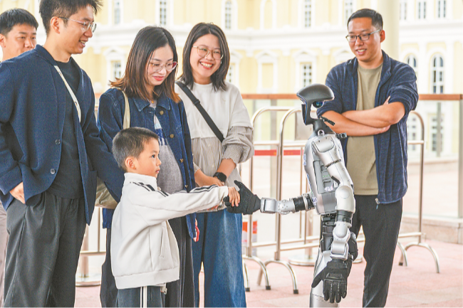 24日,在福州中洲岛,小朋友好奇地与机器人互动,感受数字科技的魅力。陈天博 摄