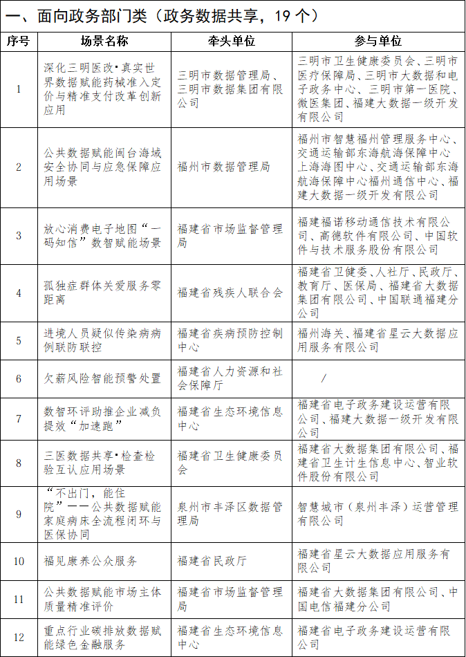 4月28日,福建省数据管理局在第九届数字中国建设峰会数字福建分论坛上发布了“福建省公共数据赋能行业应用第三批重点培育场景”建设清单,共推出47个应用场景,其中面向政务部门类(政务数据共享)19个,面向社会和市场类(公共数据开放和授权运营)28个,覆盖农业农村、医疗健康、交通运输、文化旅游、金融服务等重点行业领域。